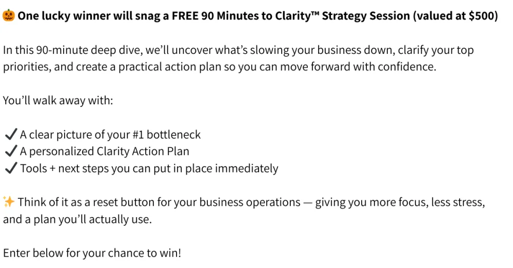 No tricks, just treats đ Halloweenâs my favorite holiday â so Iâm giving away ONE free 90 Minutes to Clarity⢠Strategy Session (normally $500).